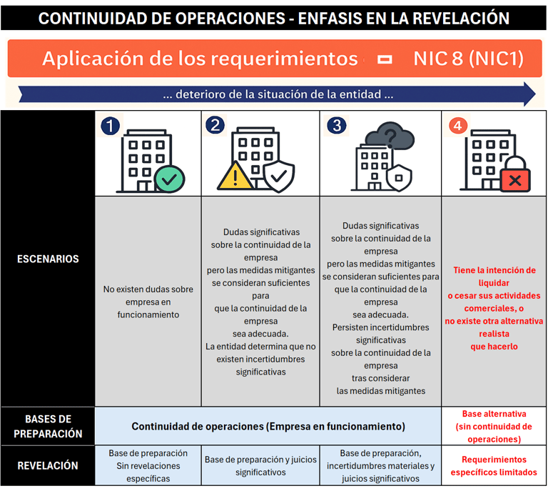 La decisión de la dirección se fundamenta en supuestos y juicios que pueden estar sujetos a una incertidumbre significativa. Por ello, es esencial que la entidad considere no solo los requisitos específicos de información relacionados con la continuidad de las operaciones establecidos en el párrafo 6K de la NIC 8 [párrafo 25 de la NIC 1], sino también los requisitos generales de revelación contemplados en la NIC 8 [NIC 1].