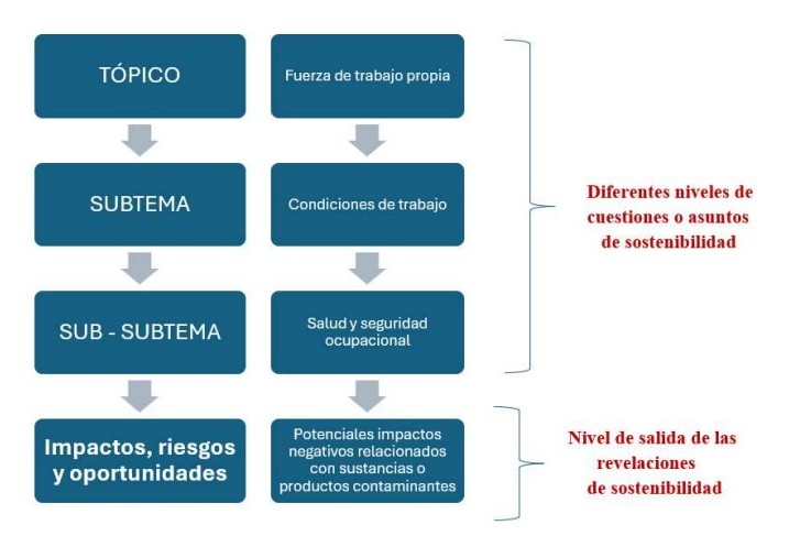Figura 2. Ejemplo de aspectos de sostenibilidad por tópico, subtema e IRO