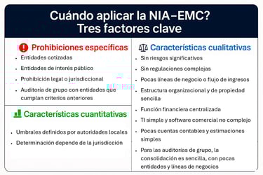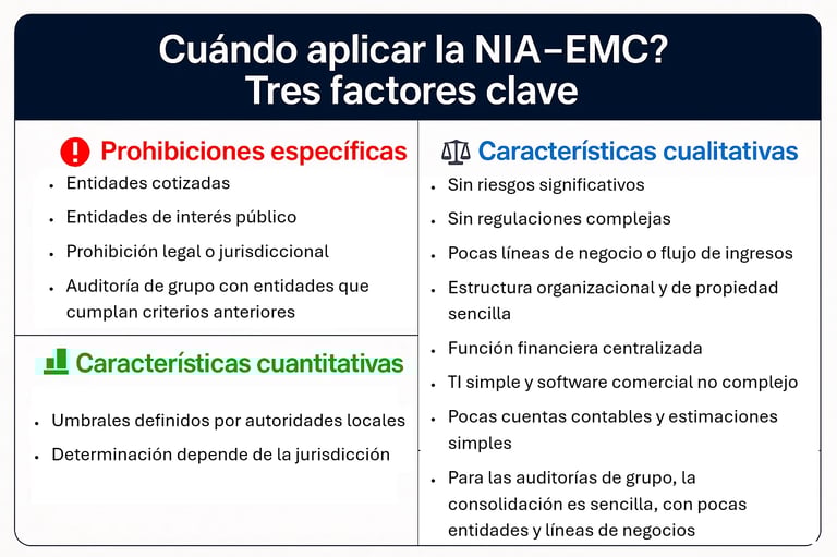 Para aplicar la NIA-EMC, la entidad debe presentar condiciones que reflejen baja complejidad. Algunos de los requisitos más relevantes son: